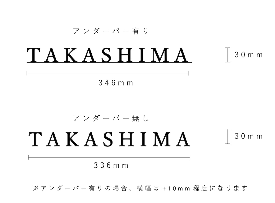 アンダーバーで文字を繋げると左右に5ミリづつ程度、全体で10ミリ程度大きくなります。
